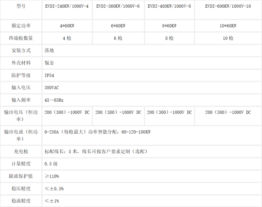 立式分体式直流充电桩EVDI系列(240-600KW-1000V产品简介 分体式直流充电桩由总控制系统与充电终端组成,集充电控制与保护、柔性功率输出、人性化功率切换,人机交互与通信、用电采集与计量等多功能与一体,可以为新能源电动汽车提供直流大功率的快速充电服务。
